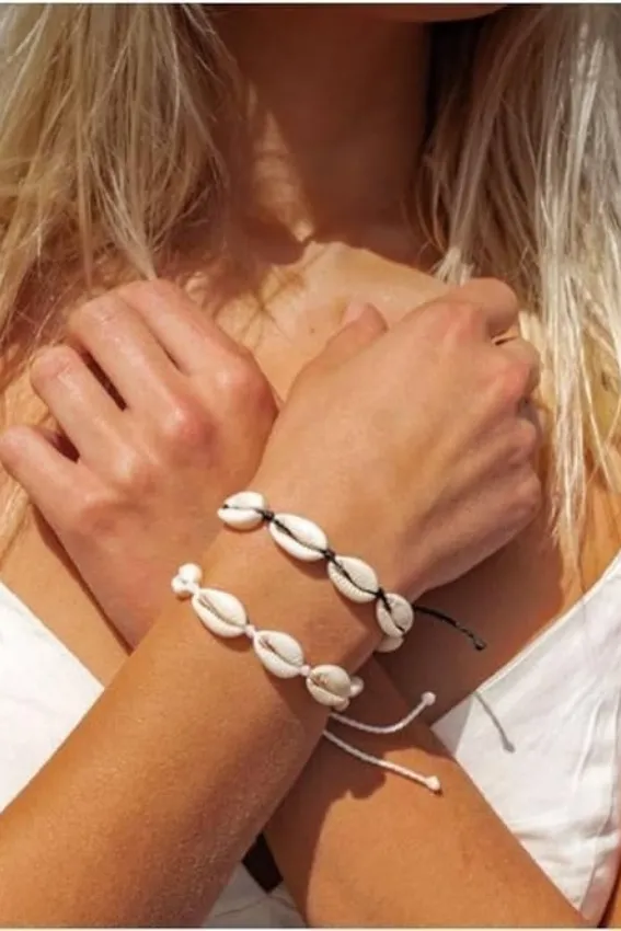سوار (غويشة) صيفي للمعصم، يتميز بصف من أصداف الودع (Cowrie Shells) الطبيعية باللون الأبيض العاجي، مُثبتة على خيط قابل للتعديل. قطعة بسيطة ومناسبة للإطلالات الشاطئية أو البوهيمية، ويمكن تعديل مقاسها بسهولة لتناسب المعصم.
