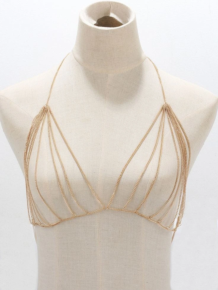أضفي لمسة من الجاذبية والجرأة على إطلالتك مع حمالة الصدر المصممة من السلاسل الذهبية المتعددة. قطعة إكسسوار فريدة تمنحك مظهراً عصرياً ومثيراً، مثالية للارتداء تحت الملابس الشفافة أو مع أزياء الشاطئ.