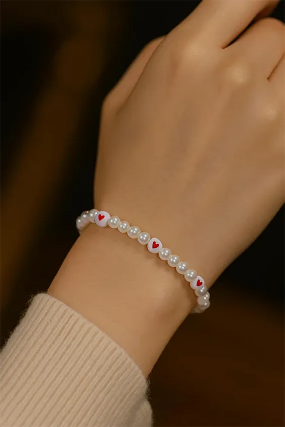 أضيفي لمسة من الرومانسية والنعومة إلى معصمك مع هذه الإسورة الأنيقة المصنوعة من لؤلؤ مستعار عالي الجودة. تتميز القطعة بتصميم كلاسيكي يجمع بين بريق اللؤلؤ الأبيض وحبيبات مزينة بقلوب حمراء صغيرة تضفي طابعاً حيوياً وعصرياً.