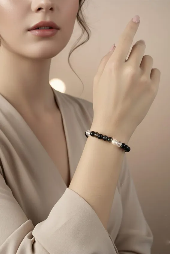 أضيفي لمسة من الفخامة والهدوء إلى معصمك مع هذه الإسوارة المصنوعة يدوياً من أحجار طبيعية مختارة بعناية. تتميز بتصميم يجمع بين التباين الكلاسيكي للأحجار السوداء والشفافة، مما يجعلها قطعة مثالية تتناسب مع مختلف الإطلالات، من الكاجوال إلى الرسمية.