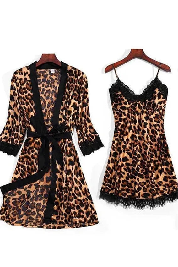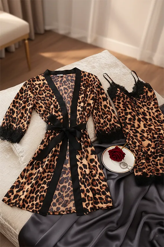 قميص نوم (شيميز) قصير ضيق بطبعة النمر (ليوبارد) الجريئة. يتميز بـ دانتيل ناعم يحيط بفتحة الصدر وحواف التنورة السفلية، وفتحة ساق جانبية جذابة. لانجري نسائي مثير وحمالات رفيعة، قطعة عصرية لـ ملابس النوم.