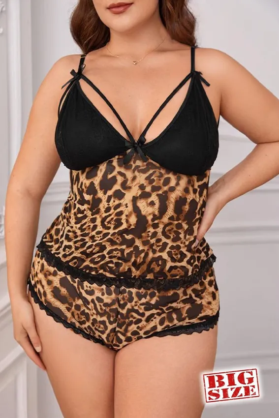 طقم لانجري أنيق مكون من قطعتين بنقشة الليوبارد الجذابة، يتميز بتصميم علوي بحمالات رفيعة وتفاصيل دانتيل ناعمة على الحواف. يوفر الشورت المريح مظهراً أنثوياً متكاملاً، مما يجعله مثالياً لإطلالة ليلية تجمع بين الأناقة والراحة.freesize(80:120kg)