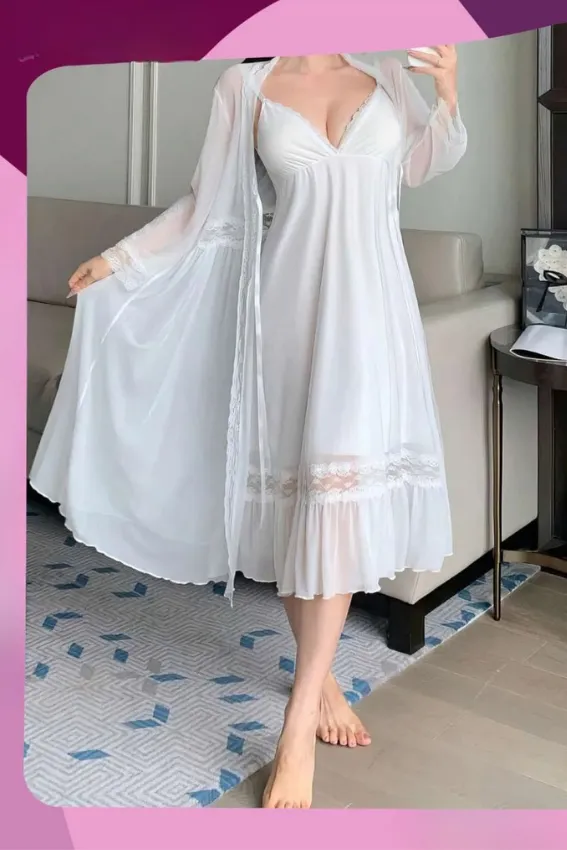 طقم نوم أنيق وفاخر يتكون من قطعتين باللون الأبيض الناصع. يشمل قميص نوم طويل مزين بالدانتيل الناعم عند الحواف، وروب شفاف يضفي لمسة من الأناقة والرقة. مثالي لإطلالة مريحة وجذابة في المنزل، ويمنح شعوراً بالنعومة والفخامة.