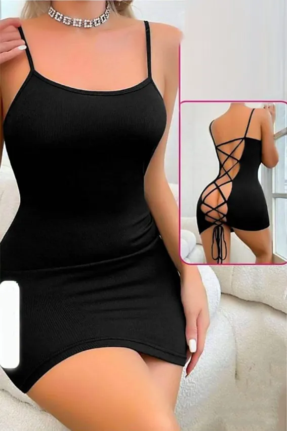 فستان قصير (ميني) بتصميم جريء وأنيق، يتميز بخامة مضلعة (Ribbed) مطاطية تبرز تفاصيل القوام بشكل مثالي. يأتي الفستان بحمالات رفيعة مع فتحة ظهر واسعة ومبتكرة بنمط “الكروس” المتشابك الذي يمتد حتى الأسفل، مما يجعله قطعة استثنائية تجمع بين البساطة في التصميم الأمامي والجاذبية في التفاصيل الخلفية.