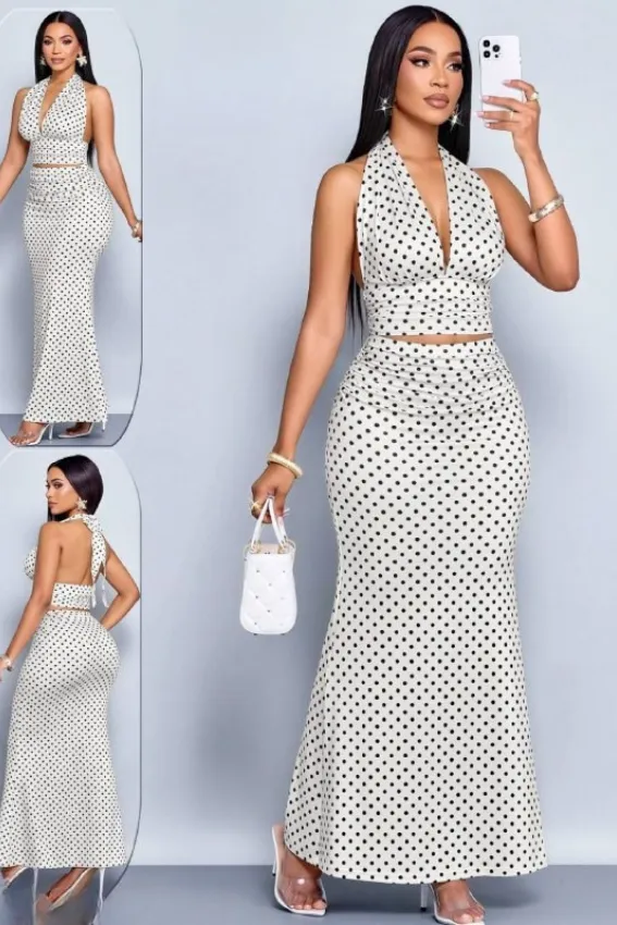 هذا الطقم المكون من قطعتين هو الخيار الأمثل لإطلالة أنيقة ومبهرة في أي مناسبة اجتماعية أو سهرة. يتميز بتوب قصير بـرقبة رسن (Halter Neck) جذابة وتنورة ماكسي طويلة وضيقة تبرز قوامكِ بشكل ساحر. نقشة البولكا دوت (Polka Dot) الكلاسيكية تضفي لمسة من الأنوثة والرقي. مصنوع من خامة مريحة وذات جودة عالية ليمنحكِ ثقة لا مثيل لها. مثالي للحفلات أو ملابس السهرة الأنيقة.