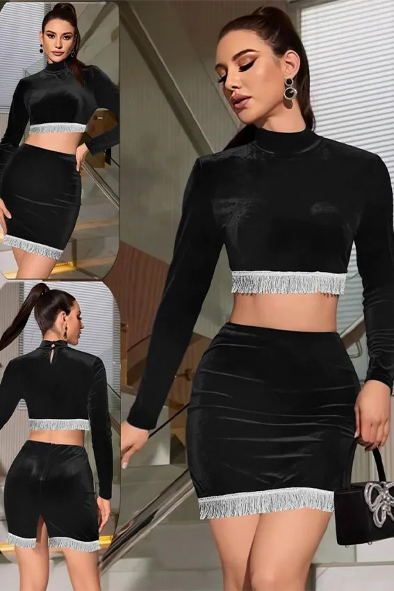 طقم مكون من قطعتين ، مصنوع من قماش المخمل الناعم. الجزء العلوي هو توب بأكمام طويلة وياقة عالية وقصة قصيرة تكشف عن منطقة الخصر. التنورة السفلية ضيقة وقصيرة. القطعتان مزينتان بتفاصيل شراشيب فضية لامعة عند الحواف السفلية.freesize(60:80kg)