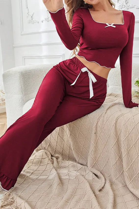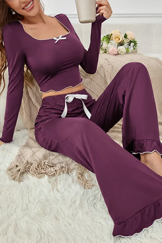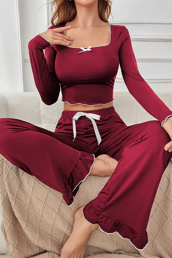 طقم ملابس منزلية (Loungewear) عصري ومريح، مصمم من قماش ناعم ومرن ليوفر أقصى درجات الراحة. يتكون الطقم من قطعتين؛ توب قصير (Crop Top) بأكمام طويلة وفتحة رقبة مربعة أنيقة مزينة بفيونكة رقيقة وحواف “مموجة” (Lettuce Trim)، وبنطال مريح بقصة أرجل واسعة تنتهي بكشكشة ناعمة عند الكاحل. يتميز التصميم بلمسات متباينة على الحواف تضفي مظهراً أنثوياً رقيقاً، مما يجعله الخيار الأمثل للاسترخاء في المنزل بأناقة وجاذبية.