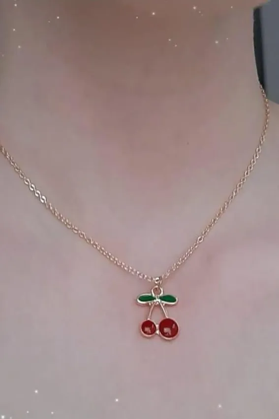 سلسلة (قلادة) ناعمة وبسيطة باللون الذهبي، مصنوعة من الاستانلس ستيل. تتميز بدلاية صغيرة على شكل حبة كرز، مطلية بالمينا (Enamel) باللون الأحمر والأخضر الزاهي. قطعة رقيقة ومرحة، مثالية للإطلالات اليومية البسيطة.