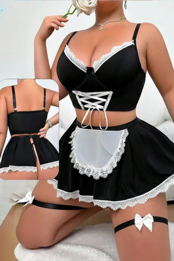 طقم لانجري زي خادمة مثير وجذاب من ثلاث قطع باللونين الأسود والأبيض. يتكون من توب قصير (Corset Top) بتصميم حمالات وكورسيه أمامي، وتنورة قصيرة** بكسرات مزودة بمريلة دانتيل بيضاء. يشمل أيضاً أربطة فخذ (Garter Belts) مزينة بفيونكات أنيقة. تصميم مثالي لجلسات التصوير أو إطلالة رومانسية وجريئة.**
