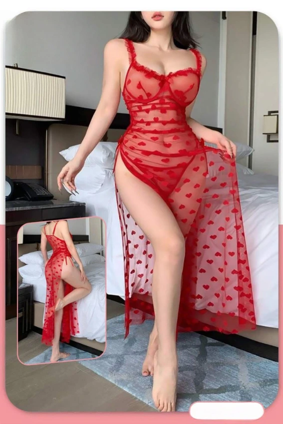 لانجيري أحمر طويل بتصميم رومانسي وجذاب، يتميز بقماش شفاف مزين بنقشة القلوب الناعمة. يأتي مع تفاصيل دانتيل ساحرة وفتحة جانبية جريئة لإطلالة لا تُنسى. قطعة مثالية للمناسبات الخاصة لتشعري بالثقة والجاذبية.