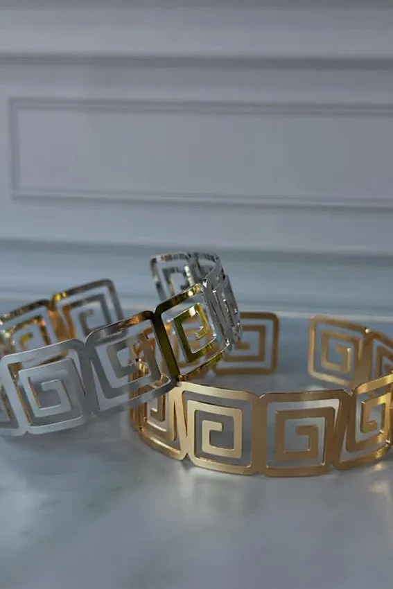 عقد رقبة ضيق (Choker) عريض باللون الذهبي، يتميز بتصميم فريد مستوحى من نقشة “المفتاح اليوناني” (Greek Key) المفرغ. هذا التصميم الهندسي يمنح العقد مظهراً جريئاً وكلاسيكياً، وهو قطعة مميزة لتزيين الرقبة وتتماشى مع الإطلالات العصرية والمسائية.