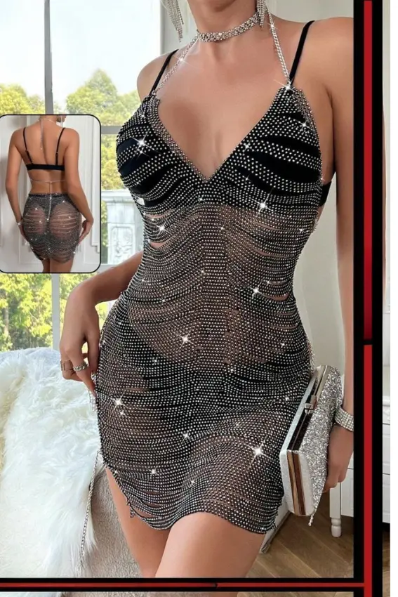 فستان قصير وجذاب بتصميم جريء ومميز، مزين بأحجار الراين اللامعة التي تغطي كامل الفستان، مما يمنحه إطلالة براقة. له حمالات رفيعة على شكل سلسلة، وظهر مكشوف لإطلالة أكثر إثارة. قطعة مثالية للحفلات والسهرات.