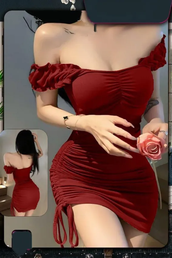 فستان قصير (Mini Dress) بقصة ضيقة** جذابة، يتميز بتصميم بدون أكتاف (Off-Shoulder) مع كشكشة أنيقة على الصدر. يزدان بتفاصيل مشدودة (Ruched) في الجوانب مع أربطة سحب تسمح بتعديل الطول والقَصة حسب الرغبة. مثالي للسهرات، الحفلات، أو الإطلالات الرومانسية. متوفر بألوان عصرية تشمل الأحمر العنابي والأزرق السماوي.**