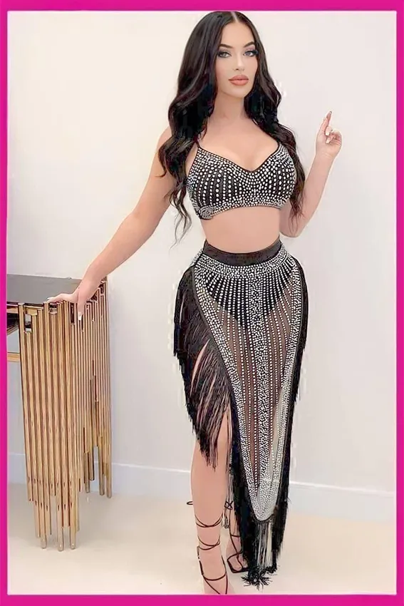 Julliet 963 – Rhinestone Tassel Mesh Skirt & Crop Top