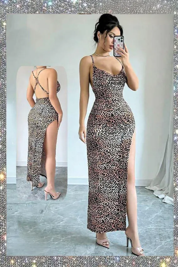 فستان طويل بقصة ضيقة ومشدودة. يتميز بنقشة جلد الحيوان (الفهد) وقصة عنق منسدلة (cowl neck). مزود بفتحة جانبية عالية جداً وحمالات كتف رفيعة متقاطعة في الظهر. تظهر الموديل مرتدية حذاءً بكعب عالٍ وإكسسوارات رقبة بسيطة.freesize(60:80kg)