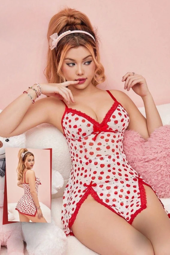 قميص نوم نسائي جذاب بتصميم نقاط وفراولة، وحواف دانتيل حمراء. مثالي لليالي الصيفية الممتعة.Freesize (60 : 80)