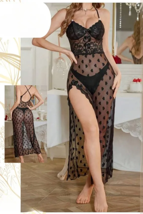LaCelia 993 – Elegant Black Heart Mesh Lingerie Dress