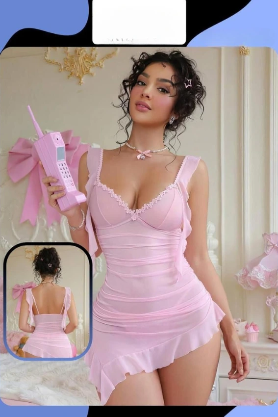 أضيفي لمسة من الأنوثة والدلال إلى لياليكِ مع طقم اللانجري الساحر هذا باللون الوردي الناعم. يتميز بتصميم أنيق ومكشكش يبرز جمال القوام، مع حواف من الدانتيل الرقيق وتفاصيل الكشكشة الجذابة. قطعة مثالية لإطلالة رومانسية لا تُنسى.