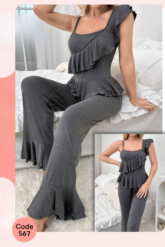 طقم بيجامة نسائي مريح وعصري، بتصميم الكشكشة الأنيق. مثالي لأوقات الراحة في المنزل.