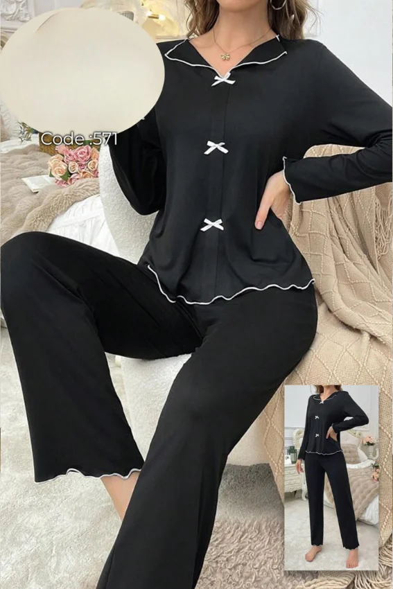 طقم بيجامة نسائي مريح وعصري باللون الأسود، مزين بفيونكات بيضاء وحواف مموجة. مثالي لأوقات النوم والاسترخاء.