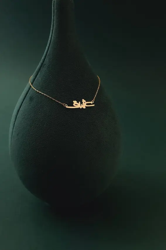 قلادة ذهبية مزينة باسم عربي بأناقة، تضيف لمسة شخصية وفريدة لإطلالتك. تصميم بسيط وفاخر يناسب جميع الأوقات والمناسبات