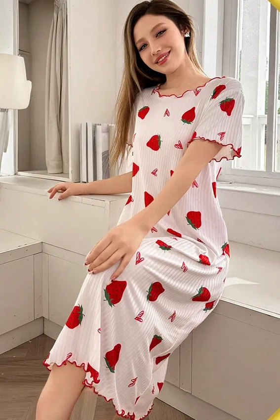 Noor 4982 – Strawberry Print Ribbed Nightgown