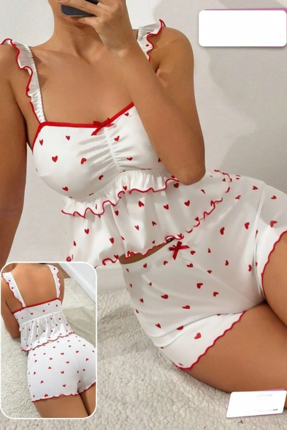 طقم بيجامة صيفي من قطعتين باللون الأبيض، مزين بطبعات قلوب حمراء صغيرة. يتميز بتفاصيل كشكشة (Ruffles) حمراء عند الحواف وحمالات رفيعة، بالإضافة إلى فيونكات حمراء صغيرة تضفي لمسة ناعمة وأنثوية. مثالي لليالي الصيفية المريحة.