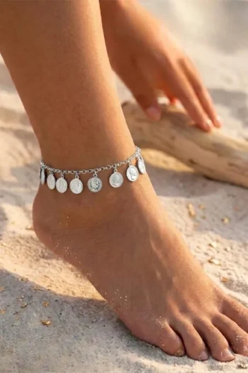خلاخال فضي يتميز بتعليقات صغيرة على شكل عملات معدنية أو ميداليات.