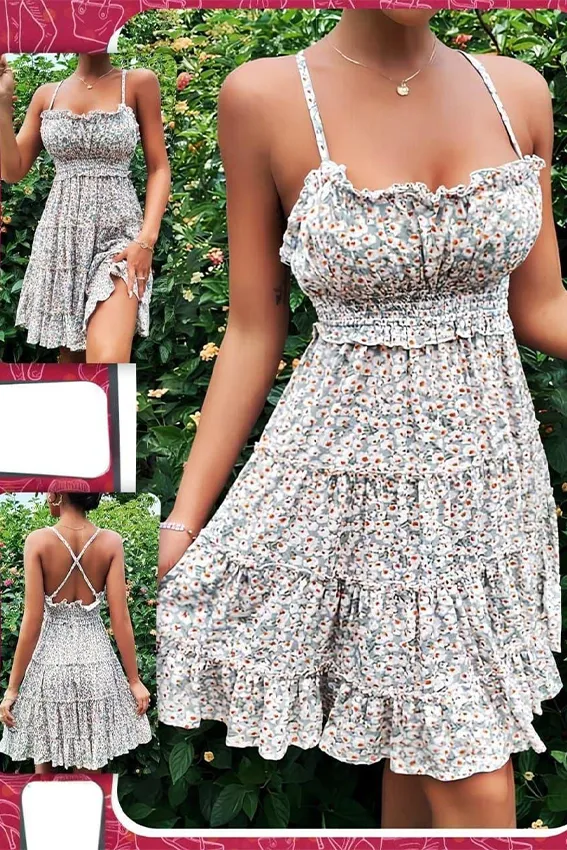 فستان صيفي قصير، شكله كيوت جداً ومطبع ورد صغنن. فيه كشكشة من فوق على الصدر وباقي الفستان طبقات بكشكشة خفيفة. الحمالات بتاعته رفيعة وبتعمل شكل X من الضهر.