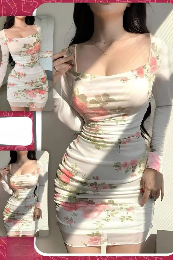 فستان قصير (Mini Dress) ضيق ومثير يتميز بنقشة زهور** ربيعية ناعمة على خلفية بيضاء. مصنوع من قماش شبكي شفاف (Mesh) بأكمام طويلة، وكشكشة مشدودة (Ruched) على الجسم لإبراز القوام. مثالي للحفلات المسائية أو الإطلالات الرومانسية الجذابة.**freesize(60:80kg)