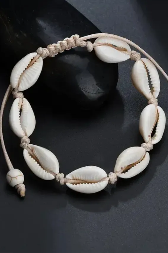 سوار (غويشة) صيفي للمعصم، يتميز بصف من أصداف الودع (Cowrie Shells) الطبيعية باللون الأبيض العاجي، مُثبتة على خيط قابل للتعديل. قطعة بسيطة ومناسبة للإطلالات الشاطئية أو البوهيمية، ويمكن تعديل مقاسها بسهولة لتناسب المعصم.