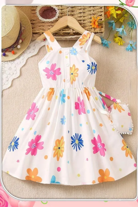 صيفي أبيض مزين برسومات زهور ملونة، مع أزرار أمامية وحمالات عريضة لإطلالة مريحة وأنيقة. تصميم مثالي للأطفال في الأيام الحارة والمناسبات غير الرسمية.