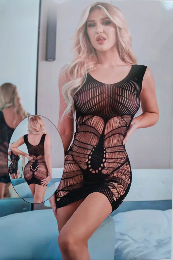 فستان قصير مثير ومصمم من نسيج شبكي (فيش نت) باللون الأسود، يتميز بتصميم فريد من نوعه مع تفاصيل مفتوحة وضيقة على الجسم لإبراز منحنياتك. قطعة مثالية لإطلالة جريئة ومختلفة في مناسباتك الخاصة.freesize(60:80)