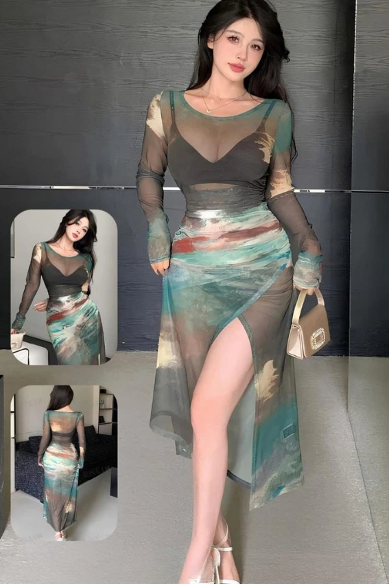 فستان طويل شفاف (Sheer Mesh) بتصميم مميز وبأكمام طويلة. يجمع بين الأناقة والجرأة بفضل قماشه الشبكي المطبوع برسومات مجردة. يحتوي على فتحة جانبية جذابة لإبراز الساق، مما يجعله خيارًا مثاليًا للسهرات والمناسبات الخاصة.